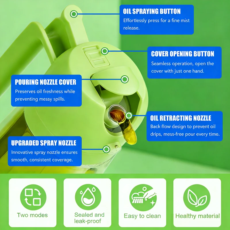 Optimize your cooking workflow with this multifunctional, eco-friendly, and stylish oil dispenser — a seamless blend of safety, convenience, and aesthetic appeal. Whether sautéing vegetables, grilling meats, preparing fresh salads, or creating flavorful marinades, this innovative light-protected oil sprayer helps lock in flavors, prevent spoilage, and extend your oils’ shelf life. Elevate your culinary creations with this essential, professional-grade kitchen accessory — designed for health-conscious, eco-friendly, and modern kitchens seeking efficiency, freshness, and premium food quality.