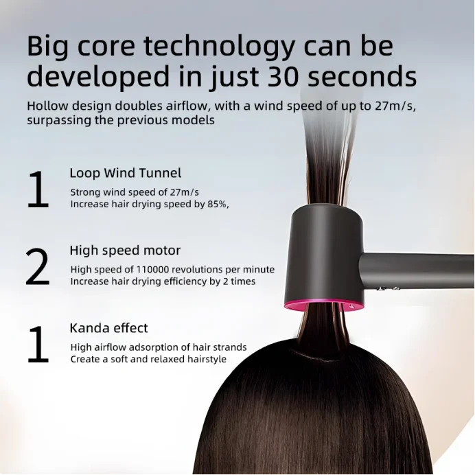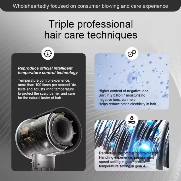 Reproduce official intelligent temperature control technology; Temperature control experience, more than 100 times per second detects and adjusts wind temperature to protect the scalp barrier and care for the natural luster of hair. |